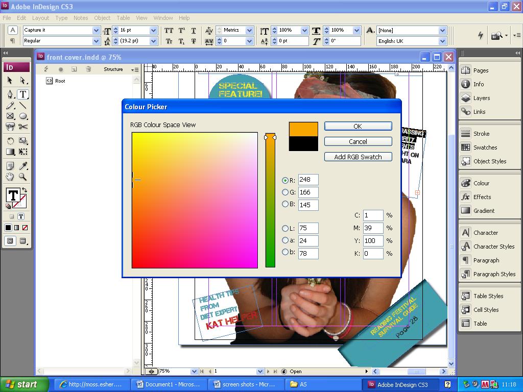 I used the colour tool to make sure I used matching colours, when I wanted to use the same colour again I made sure the numbers on the colour chart were the same, so that I got the exact same colour. This helped me to create a colour code that structured my front covers look. I used mostly yellow, blue, black, white and pink. All of these colours matched up to the colours of the accessories and make up on my model. The colours are mostly feminine when combined together, but they're not overwhelmingly feminine so can attract a variety of girls. The colours are vibrant and youthful which suits my target audience of girls aged 15-19.Feed back from questionnaire helped me to create this colour scheme, as the people I asked had a similar colour preference of blues, pinks and golds, which I used in my front cover.